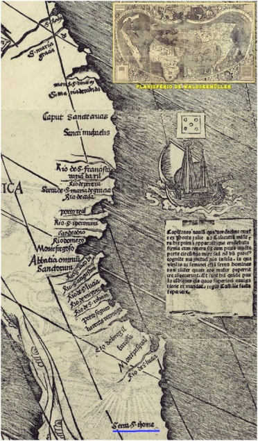 Na cartografia, a América aparece pela primeira vez no planisfério de Cantino, de 1502. Ele é ainda bastante genérico. Com as navegações europeias no Atlântico e no Índico, a cartografia passou por um rico processo de expansão. O planisfério do genovês Nicolau Caveri também privilegia o geral. Selecionamos alguns mapas em que existe ao menos uma referência à região entre 1507 e 1534. O primeiro é o mapa-múndi do cartógrafo alemão Martin Waldseemüller, que batizou o novo mundo de América em homenagem a Américo Vespúcio. Ele data de 1507, figurando o topônimo Serra de São Tomé. Crê-se tratar-se do maciço do Itaoca, visto pelo navegante na altura do cabo de São Tomé. No mapa, sublinhamos o nome em azul.