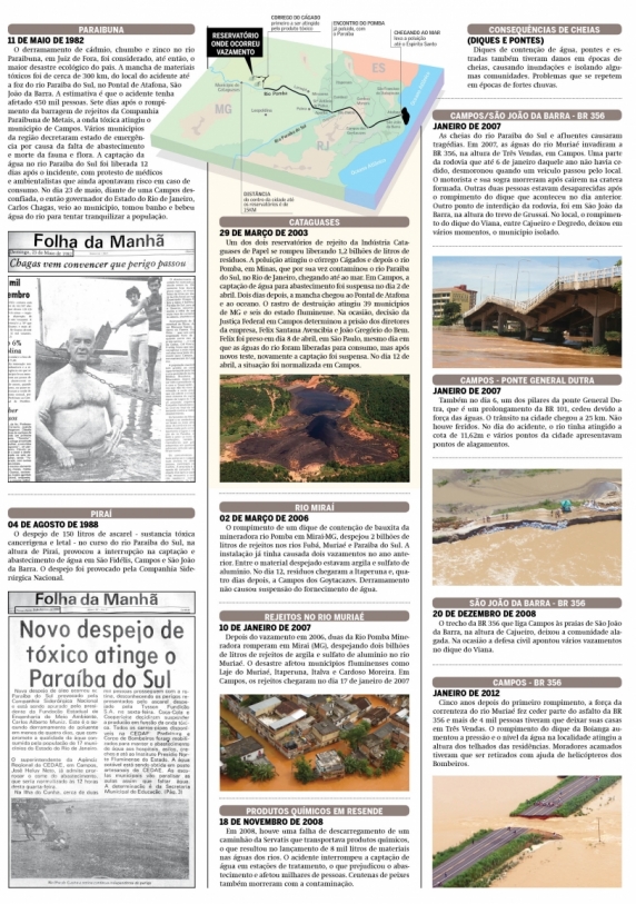 A história da bacia hidrográfica do rio Paraíba do Sul é marcada por danos ambientais causados por rompimentos de barragens ou despejo irregular de componentes tóxicos. Em alguns casos, várias cidades do estado de Minas Gerais e Rio de Janeiro tiveram o abastecimento de água interrompido, entre elas Campos e Itaperuna, nas regiões Norte e Noroeste Fluminense. Na década de 1980, após a marcante tragédia do rio Paraíbuna, o então governador do Rio, Carlos Chagas, precisou vir a Campos e entrou no rio Paraíba para mostrar que não havia mais riscos de contaminação. Outro grande desastre ecológico que marcou a região foi o rompimento do reservatório da empresa Cataguases de Papel, em março de 2003. Na ocasião, o rastro de destruição atingiu 39 municípios de MG e seis do Rio de Janeiro, incluindo cidades das regiões Norte e Noroeste Fluminense.