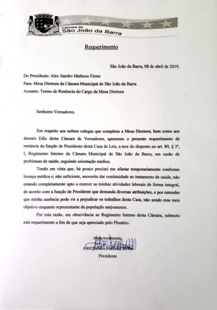 Abaixo, confira o requerimento encaminhado por Alex à Câmara de SJB: