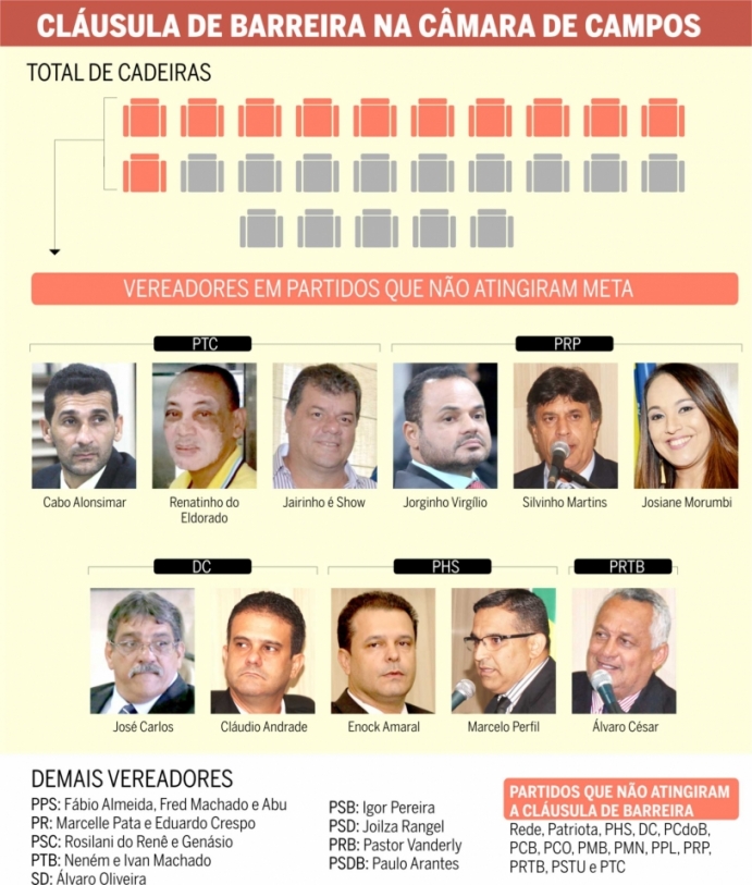 Dos 35 partidos políticos registrados no Brasil, 14 não alcançaram a chamada cláusula de barreira e perderam direito de acesso ao dinheiro do fundo partidário e do tempo de propaganda gratuita no rádio e televisão. Uma parte destas legendas barradas está sendo incorporada a outras com maior representatividade, enquanto algumas anunciaram que vão seguir existindo, mesmo sem a verba pública. Dos 25 vereadores de Campos, 11 atualmente estão em partidos que não passaram pela nova regra eleitoral. A pouco mais de um ano para a próxima eleição municipal, a movimentação nos bastidores é intensa, com negociações e convites aos parlamentares campistas.