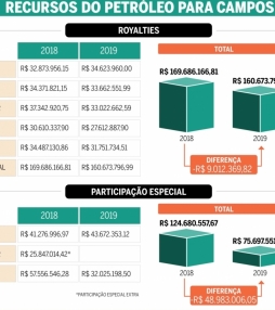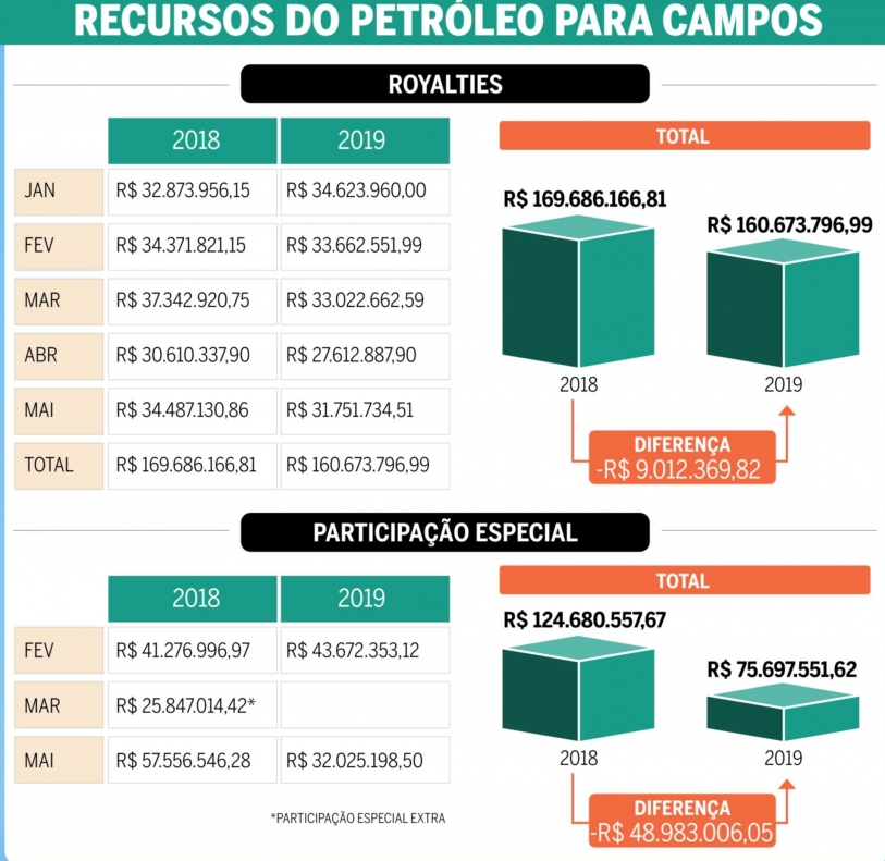 Em 2018, foram R$ 294 milhões de royalties e participações especiais de janeiro a maio. Neste 2019, o valor caiu para R$ 236 milhões no mesmo período. Mas a cidade sofre com a queda dos royalties desde 2015. Para efeitos comparativos, antes da crise, nos anos de 2013 e 2014, as receitas municipais recebidas provenientes da produção de petróleo e gás natural foram de R$ 1,3 bilhão e R$ 1,5 bi (este último já incluídos os valores da operação de crédito Venda do Futuro). Nos anos 2017 e 2018, primeiros dois anos da atual gestão municipal, o caixa das receitas de mesma origem foi de R$ 481 milhões e R$ 726 milhões.