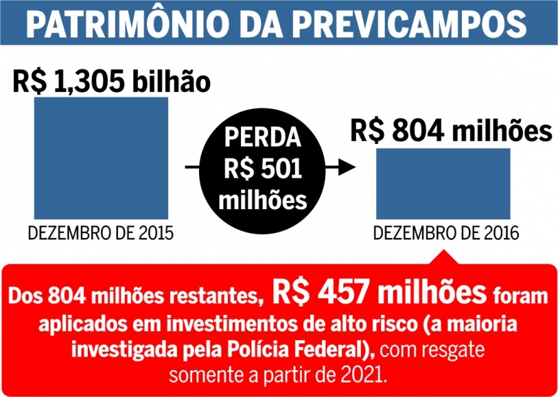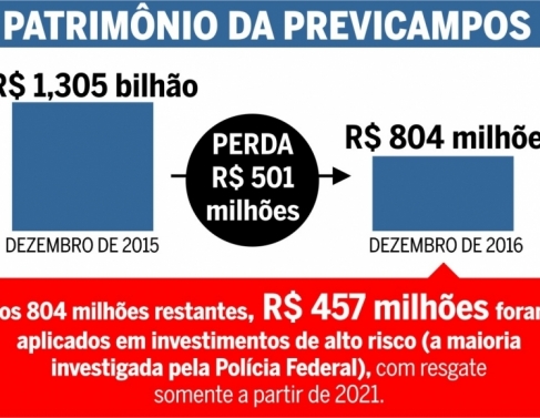 Em apenas um ano, o Instituto de Previdência de Campos (Previcampos) viu seu patrimônio passar R$ 1,305 bilhão em dezembro de 2015 para R$ 804 milhões em dezembro de 2016. Foi meio bilhão de reais perdido da instituição que, em sua concepção, representa tranquilidade para servidores ou suas famílias em momentos mais difíceis: doença, aposentadoria ou morte. Embora os R$ 804 milhões restantes sejam um valor significativo, destes, R$ 457 milhões foram aplicados em investimentos de alto risco – a maioria investigada pela Polícia Federal e com resgate somente a partir de 2021.