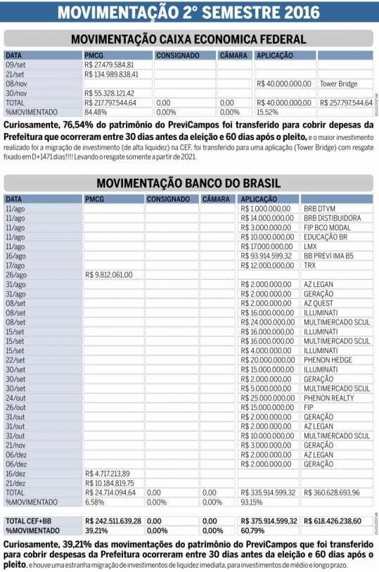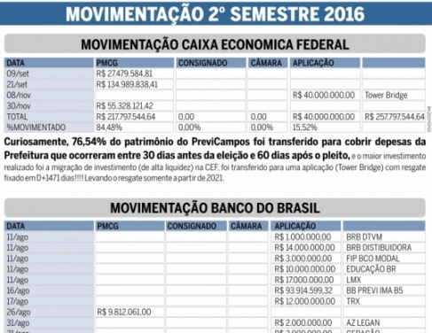 De acordo com o relatório, “fica evidenciado que a movimentação realizada entre agosto e dezembro de 2016 comprometeu a liquidez da carteira de investimentos do Previcampos”. O documento ainda destaca “um movimento atípico de resgates em fundos que certamente tinham entidades potencialmente menos expostas a riscos de gestão (Banco do Brasil e Caixa Econômica Federal), transferindo esses investimentos para outros de menor solidez, menor liquidez e potencialmente com maior exposição a riscos”. Isso, às vésperas das eleições municipais de 2016.
