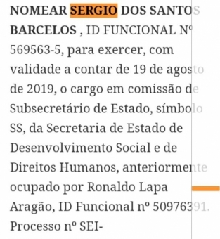 Sérgio dos Santos Barcelos começou na política com o ex-governador Garotinho, logo se tornou homem de confiança do ex-alcaide. Ele também teve participação em outros mandatos, inclusive com o senador Romário (Podemos). Atualmente, Sérgio foi nomeado como subsecretário de Estado, símbolo SS, da secretaria de Estado de Desenvolvimento Social e de Direitos Humanos.