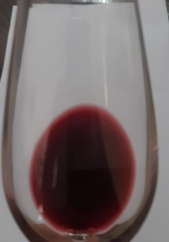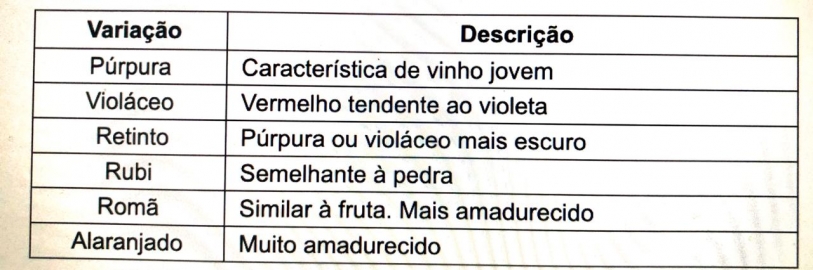 Nesse ponto, coloca-se em questão o grau de envelhecimento do vinho. Nos vinhos tintos, quando observados com a taça inclinada sobre o fundo branco, a cor nitidamente púrpura denota um vinho novo, juvenil.