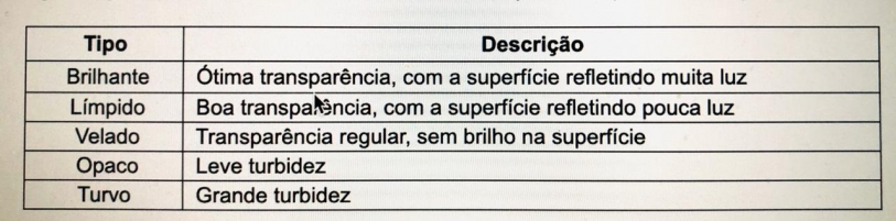 Transparência: para se julgar a transparência, a taça deve ser inclinada diante de uma superfície branca. Ele será julgado transparente se algum objeto ou escrita colocado contra esse fundo puder ser percebido com nitidez.