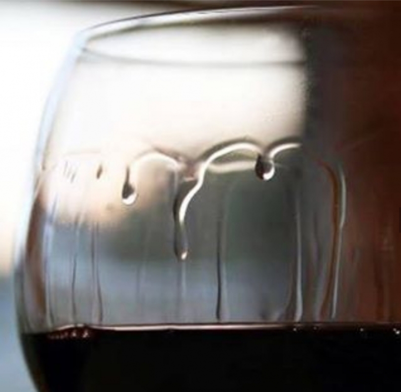 Viscosidade (lágrimas): para que julguemos as lágrimas de um vinho, devemos imprimir movimentos circulares à taça, de modo que haja uma aderência do líquido nas paredes dessa. O vinho, então, escorrerá em forma de lágrimas pelas paredes da taça. Quanto mais "preguiçosas" forem as lágrimas, maior o teor alcoólico e o corpo do vinho. Por outro lado, a maior fluidez indicará um vinho mais leve e magro. O fenômeno se explica pela maior tensão superficial do álcool em relação à água. Os portugueses chamam as lágrimas de pernas.