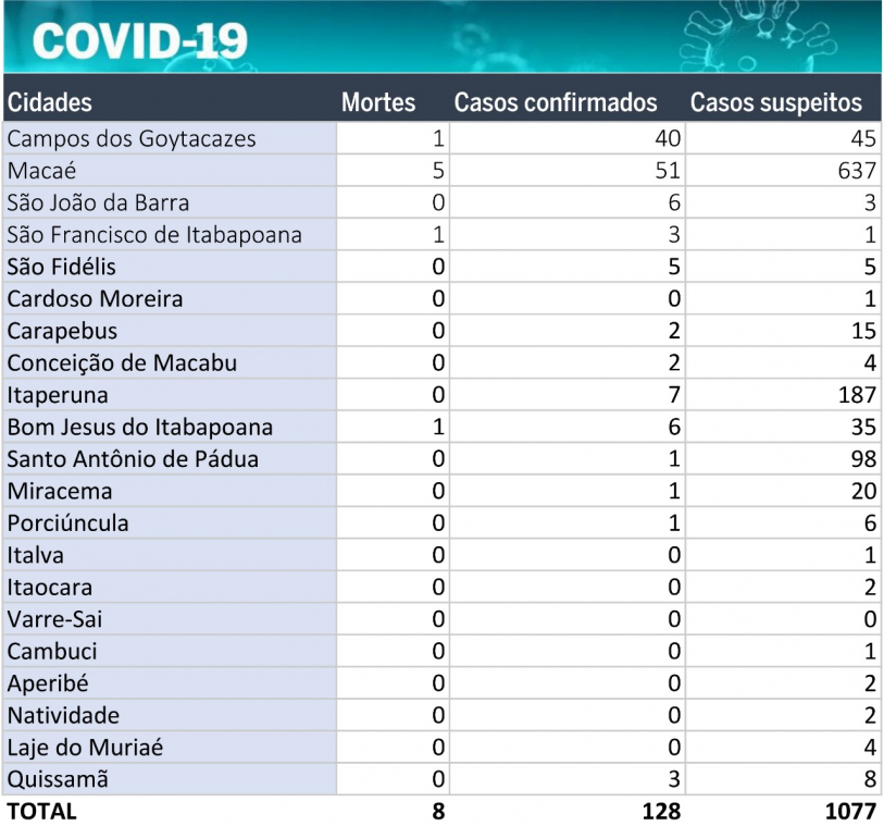 Foram registradas mortes por Covid-19 nos seguintes municípios: Macaé (5), Campos (1), São Francisco de Itabapoana (1) e Bom Jesus do Itabapoana (1).