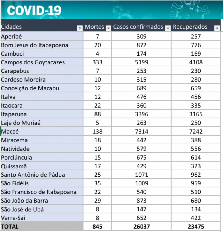 Os municípios do Norte e Noroeste Fluminense contabilizam, nesta sexta-feira (10), 845 mortes em decorrência do novo coronavírus, desde o início da pandemia. Nos 22 municípios, 26.037 casos de Covid-19 já foram registrados. Já o número de pacientes recuperados chega a 23.475.