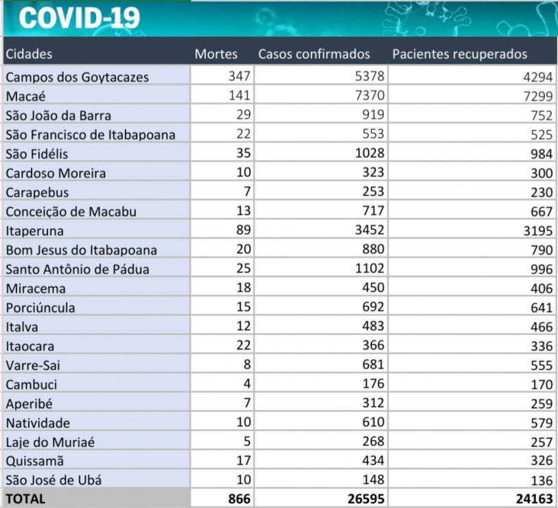 Os municípios do Norte e Noroeste Fluminense contabilizam, nesta quarta-feira (16), 866 mortes em decorrência do novo coronavírus, desde o início da pandemia. Nos 22 municípios, 26.595 casos de Covid-19 já foram registrados. Já o número de pacientes recuperados chega a 24.163.