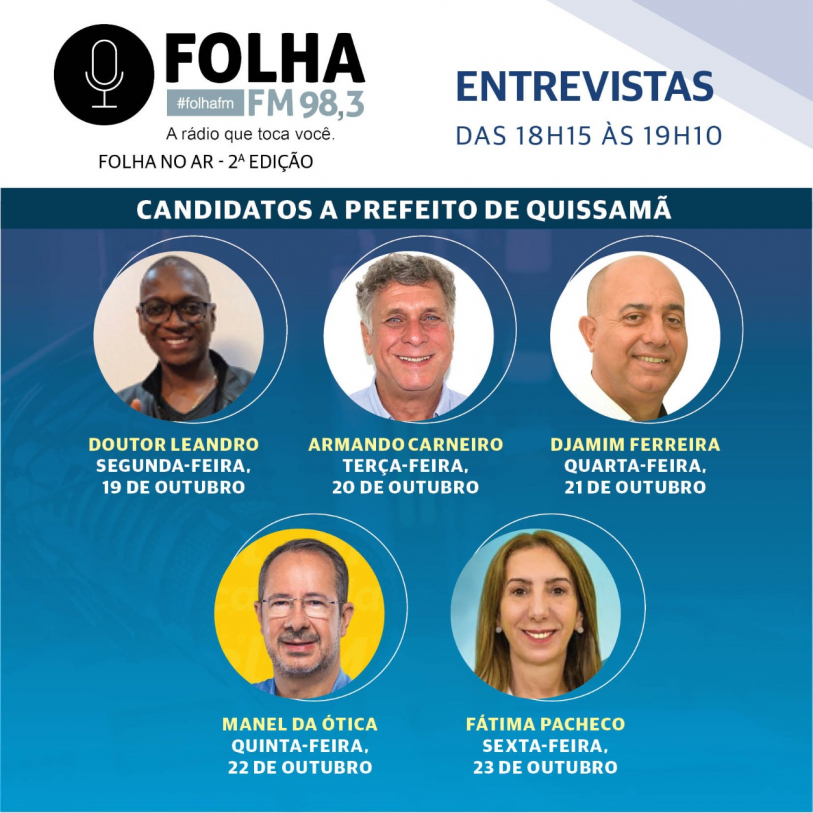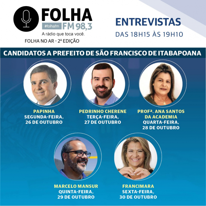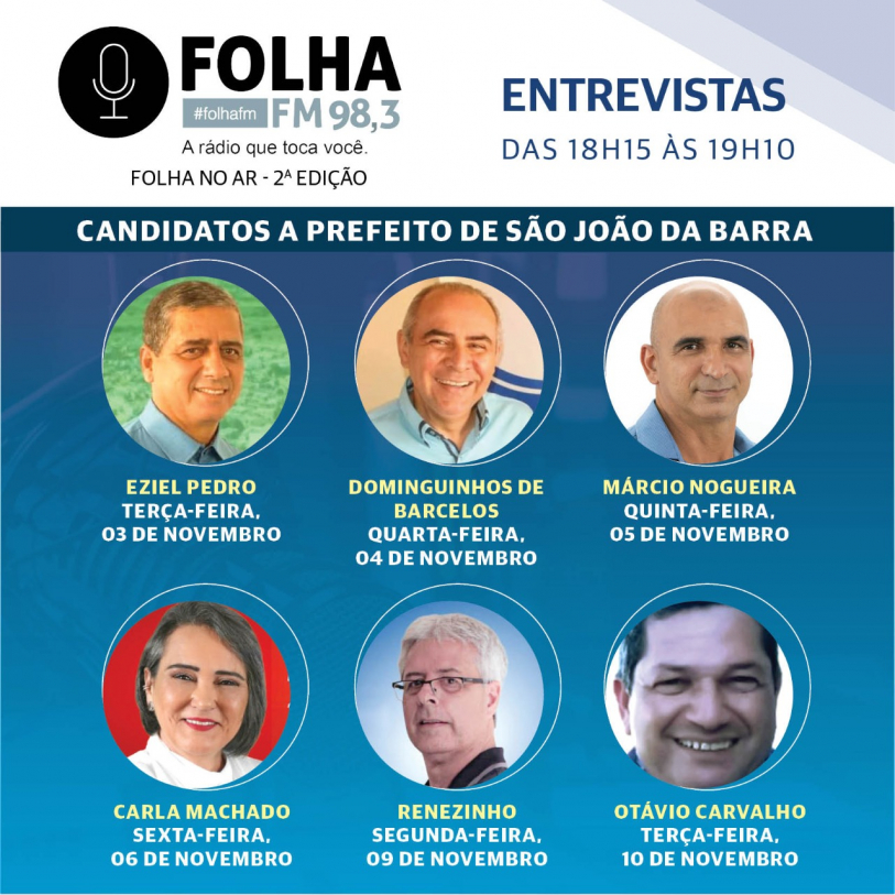 O Grupo Folha da Manhã vai entrevistar os candidatos a prefeito das cidades de Quissamã, São Francisco de Itabapoana e São João da Barra. O mesmo espaço será concedido aos candidatos dos três municípios. Eles vão participar do Folha no Ar 2ª Edição, das 18h15 às 19h10, na Folha FM 98,3, entre os dias 19 de outubro e 10 de novembro, com transmissão simultânea pela página da emissora no Facebook e exibição também na PlenaTV. A ordem das entrevistas foi definida em sorteio realizado nesta quinta-feira (8), com a participação, por videoconferência, de representantes de candidatos.