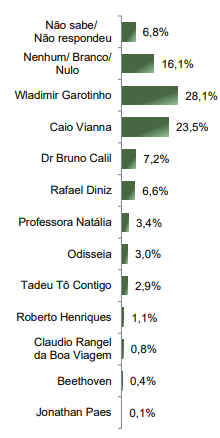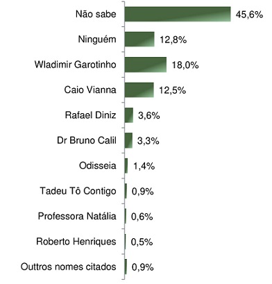 Na pesquisa espontânea, Wladimir lidera com uma folga um pouco maior sobre Caio, com 18,0% a 12,5%. Em terceiro viria o prefeito Rafael Diniz, com 3,6%, seguindo de Bruno Calil com 3,3%. Odisseia tem 1,4%; Tadeu Tô Contigo com 0,9%; Professora Natália 0,6%; Roberto Henriques com 0,5%. Impressiona o número de indecisos ainda, de 45,6%. Confira: