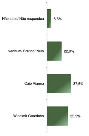 Porém, o embate entre Wladimir e Caio no 2º turno seria duro pela pesquisa: 37,6% para o filho de Arnaldo Vianna e 32,9% para o filho de Anthony Garotinho. Apesar da vantagem nominal de Caio, pela margem de erro ambos estariam em empate técnico. Confira: