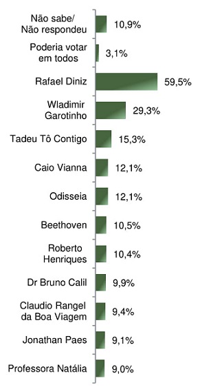 A seguir vem Wladimir Garotinho, com 29,3%. Apesar de ser o mais "leve" dos Garotinhos, com bom trânsito em várias classes sociais, além de um ótimo mandato como deputado federal, Wladimir recebe a carga de rejeição do pai, o ex-governador Anthony Garotinho, historicamente alta.