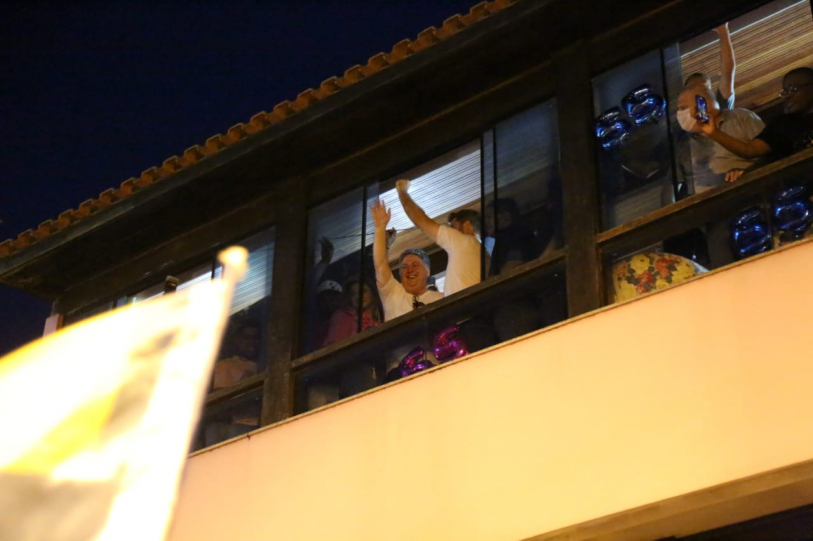 19h24 - Ao lado dos pais, os ex-governadores Anthony e Rosinha Garotinho, Wladimir acena para os apoiadores da janela de casa.