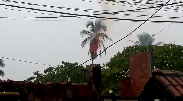 Durante temporal que atingiu a região, um coqueiro pegou fogo após ser atingido por um raio no início da tarde desta segunda-feira (22). A árvore, localizada na praça São Pedro, ficou totalmente destruída. Apesar do incidente que assustou moradores do entorno, ninguém ficou ferido.