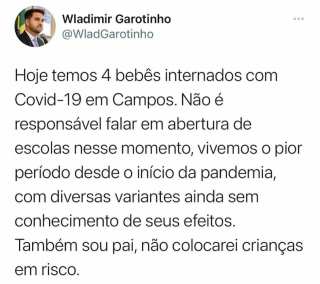O prefeito de Campos, Wladimir Garotinho (PSD), usou suas redes sociais, nesta noite de quarta-feira (10), para comunicar que o município teria quatro bebês internados com Covid-19. No entanto, em nota, enviada na tarde desta quinta-feira (11), a Prefeitura informou que, das nove crianças internadas em unidades hospitalares do município, sete, com idades de 2 a 9 meses, testaram positivo para a doença.