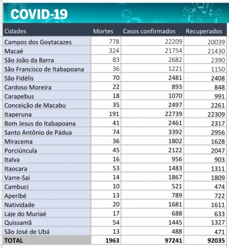 O Norte e o Noroeste Fluminense registraram, nesta terça-feira (16), novos casos e mortes por Covid-19. No total, as duas regiões somam 1.963 mortes, 97.241 pessoas infectadas pelo novo coronavírus e 92.035 pacientes já se recuperaram da doença.