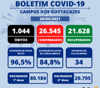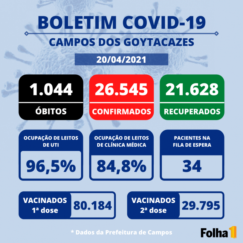 Novo boletim epidemiológico divulgado nesta terça-feira (20) confirmou mais nove mortes e 221 novos casos de Covid-19 em 24 horas. Desde o início da pandemia, o município registrou 26.545 casos confirmados de Covid-19 e 21.628 recuperados. Ao todo, 1.044 pessoas morreram no município em decorrência da Covid-19. Campos tem 34 pessoas na fila de espera por leito Covid.