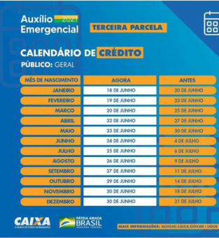 No último dia 15, a Caixa anunciou a antecipação do pagamento da terceira parcela. O calendário de depósitos, que começaria no último dia 20 e terminaria em 21 de julho, foi antecipado para o período de 18 a 30 de junho.
