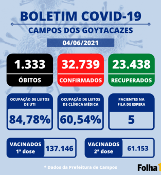 O município de Campos confirmou mais 13 mortes e 975 casos de Covid-19 em 48 horas, somando, nesta sexta-feira (4), 1.333 óbitos e 32.739 pessoas infectadas desde o início da pandemia. Do total de casos, 23.438 pacientes já se recuperaram.