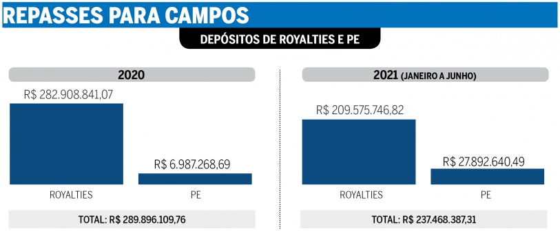 Nesses primeiros seis meses de 2021, Campos arrecadou R$ 209.575.746,82 em royalties e R$ 27.892.640,49 em participação especial. Em 2020, o município recebeu, ao todo, R$ 289.896.109,76 — R$282.908.841,07 de royalties e R$6.987.268,69 de PE. Os dados, de acordo com a Federação das Indústrias do Estado do Rio de Janeiro (Firjan), apontam para um crescimento na produção do país, com a continuidade do protagonismo do Rio de Janeiro, e leva a perspectivas mais otimistas. O volume de produção, a taxa de câmbio e a recuperação do preço do barril de petróleo foram os responsáveis pela recuperação dos recursos.