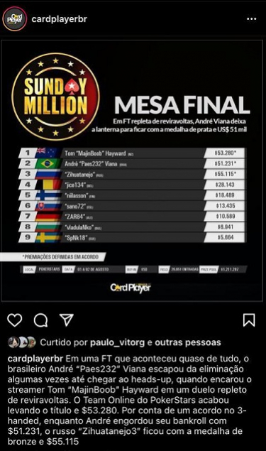 O campista André Paes Viana foi medalha de prata no pôquer, no Sunday Million, faturando a bagatela de US$ 51,2 mil, equivalentes hoje a aproximadamente R$ 270 mil. André, que joga com o nome Andre "Paes232" Viana, escapou da eliminação por várias vezes e chegou a ser lanterna, mas com incrível reação e várias reviravoltas brilhou para alcançar o segundo prêmio máximo.