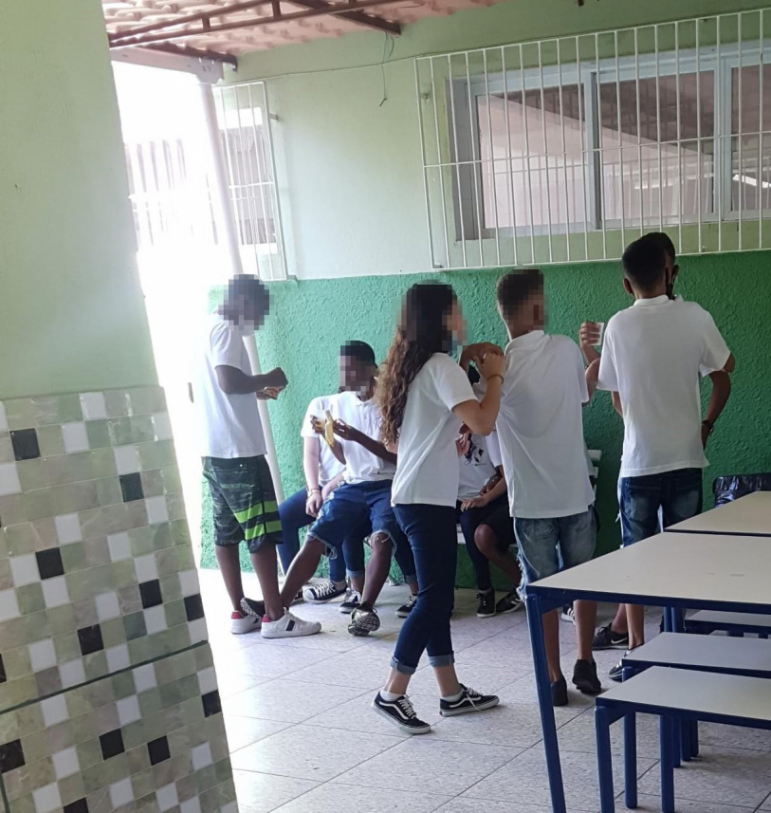 “A coisa está absurda, a escola está dando intervalo de 10 minutos para os alunos. Eles se encontram nos corredores, se abraçam, se beijam, sentam um no colo do outro, conversam perto, sem máscara e a escola tem três casos de alunos que estavam com Covid e nada está sendo feito. Estamos preocupados. Inicialmente, a Vigilância Sanitária disse que só podia 10 alunos por turma, mas tem turmas com 15 alunos, numa sala que a Vigilância disse que só cabiam 10. A gente não sabe o que fazer!.Se tem três casos, a escola não devia fechar para fazer uma higienização? O que acontece nesses casos? Estamos muito perdidos",o relato é de um profissional da Escola Estadual Constantino Fernandes,noParque Benta Pereira, que oferece Fundamental II e Ensino Médio. A Folha tentou falar com a unidade, por telefone, mas a ligação édirecionada para outros endereços.