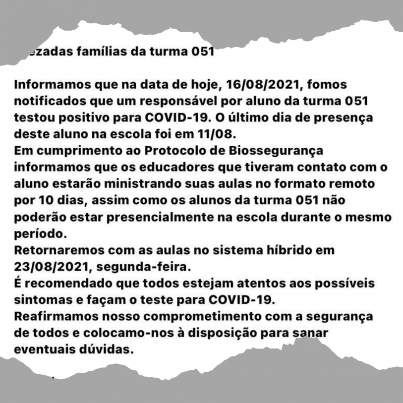 Bilhetes com o texto “Tomamos conhecimento de que um aluno testou positivo para Covid-19... e informamos que a turma deverá ser suspensa das aulas presenciais por 10 dias” têm sido recorrentes nas agendas.