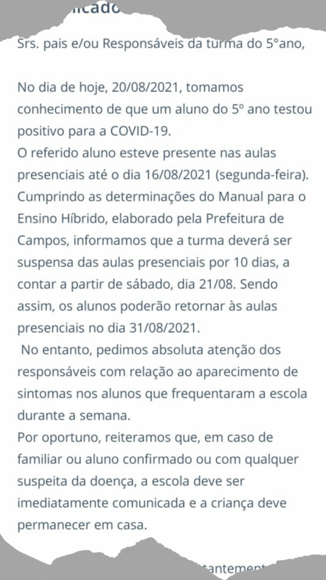 Em nota, o Sindicato dos Profissionais da Educação (Sepe), em Campos, informa que égrande o volume de denúncias que vem recebendo. “Desde o início do ensino híbrido apontamos para o risco maior de contágio de crianças, adolescentes, profissionais de educação e respectivos familiares. Isso, infelizmente, tem se confirmado com o número de denúncias que chegam até nós, desde o descumprimento dos protocolos indicados para maior proteção da comunidade escolar até o número de casos confirmados cujos números muitas das vezes são ocultados. Isso não é surpresa para nós que conhecemos o dia a dia da rotina escolar. Diante disso, as autoridades devem repensar as orientações para o retorno com ensino híbrido e voltar a fechar as escolas priorizando o ensino remoto como desde o início da pandemia”, diz trecho.