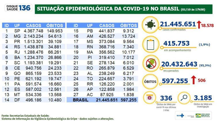 O Brasil registrou mais 18.578 casos de covid-19 e 506 mortes causadas pela doença nas últimas 24 horas, segundo o boletim da situação epidemiológica divulgado nesta sexta-feira (1º) pelo Ministério da Saúde. Com isso, chega a 597.255 o número de pessoas que perderam a vida para a doença.