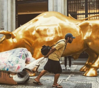 Como o jornalismo se faz com imagem, texto, ideias, fatos e análises, o repórter Thiago Queiroz, do Estadão, registrou o resumo do absurdo: um homem, arrastando material para reciclagem, de cabeça baixa, passa pelo touro de ouro.