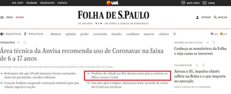 Na Folha de São Paulo, Catia Seabra destacou que Carla lançou dúvidas sobre a eficácia da vacina e “contrariando evidências científicas e recomendação de entidades médicas como a Sociedade Brasileira de Pediatria (SBP), entre outras”. A repórter ainda observou que, além de desencorajar a vacinação das crianças, a Carla aproveitou para “dar sua receita de saúde, que inclui água morna, própolis, meditação e 20 minutos de sol pela manhã, a prefeita disse ainda que, ‘tomando ou não tomando a vacina, a gente continua a transmitir e continua se contagiar’ com o coronavírus”. A matéria teve chamada na capa, junto com a manchete que fala sobre a recomendação da Anvisa para Coronavac para faixa etária de 6 a 17 anos.