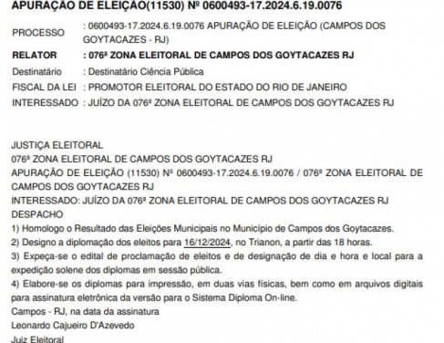 O juiz da 76ª Zona Eleitoral, Leonardo Cajueiro D’Azevedo, homologou o resultado das eleições municipais de Campos e designou para o dia 16 de dezembro a diplomação do prefeito reeleito Wladimir Garotinho (PP), de seu vice Frederico Paes (MDB) e dos demais candidatos a vereador eleitos neste ano.