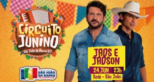 O Circuito Junino em São João da Barra promete ser agitado nesta segunda-feira (24), dia de São João Batista. Na programação musical o público vai curtir o show da dupla sertaneja Jads e Jadson. A apresentação está prevista para as 23h, na Praça de São João Batista. Os fãs poderão cantar e dançar as canções antigas e as atuais que fazem parte da turnê do álbum “20 anos de História”, lançado em abril de 2023, na casa de shows Villa Country, em São Paulo.