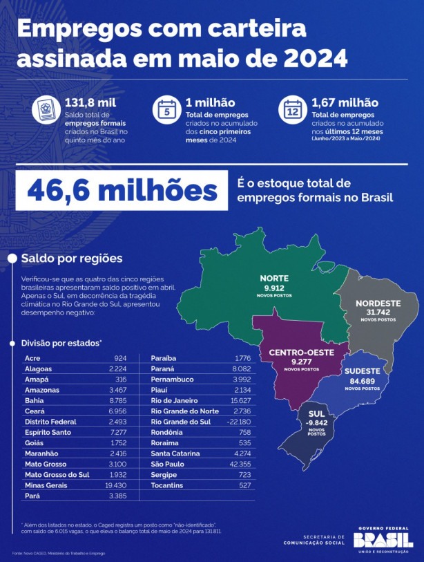 Regiões — Por conta da crise climática no Rio Grande do Sul, a região Sul foi a única das cinco regiões do país que apresentou desempenho negativo. O Sudeste lidera a lista, com a geração de 84.689 novos postos formais. É seguido por Nordeste (31.742), Norte (9.912) e Centro-Oeste (9.277). Já o Sul, puxado pelo estado gaúcho, registrou saldo de -9.824.