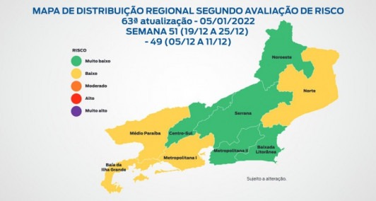 A 63ª edição do Mapa de Risco da Covid-19, divulgada nessa sexta-feira (7) pela secretaria de Estado de Saúde (SES), mostra que as regiões Metropolitana II, Baixada Litorânea, Serrana, Noroeste e Centro Sul estão classificadas em bandeira verde. Já as regiões Metropolitana I, Baía de Ilha Grande, Médio Paraíba e Norte ficaram em bandeira amarela. Na classificação geral, o estado se mantém em bandeira verde. A análise compara as semanas epidemiológicas 51 (de 19 a 25 de dezembro) e 49 (de 05 a 11 de dezembro).
