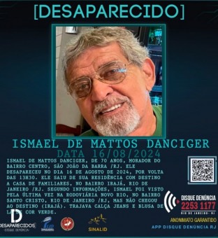 Ismael de Mattos Danciger, de 70 anos, é morador do centro de São João da Barra, no município do Rio de Janeiro. Ele desapareceu no dia 16 de agosto de 2024, por volta das 13h30, quando saiu de sua residência com destino a casa de familiares, no bairro Irajá, na Zona Norte do Rio.