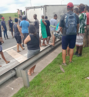 Na manhã desta sexta-feira (8), um caminhão com carga de carne tombou na BR-101, na altura da localidade de Caxeta, em Campos. Não houve feridos no acidente, mas imagens que circulam na internet mostram várias pessoas saqueando a carga do caminhão, cerca de 4,5 toneladas da carne.