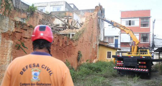 Foi iniciada na tarde desta sexta-feira (28) a demolição de um prédio em situação de risco na rua Lacerda Sobrinho, no Centro de Campos. O imóvel já havia sido interditado pela Defesa Civil na quinta-feira (27), após o telhado ceder devido às chuvas intensas dos últimos dias.