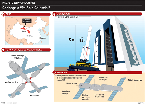 A China lançou, no dia 29 de setembro, a nave experimental Tiangong 1 com o objetivo de avançar no projeto de construir uma estação espacial nacional. O voo aconteceu às 10h16 (horário de Brasília), a partir de um centro de lançamentos em Jiuquan, cidade na província de Gansu, no centro-norte do país.