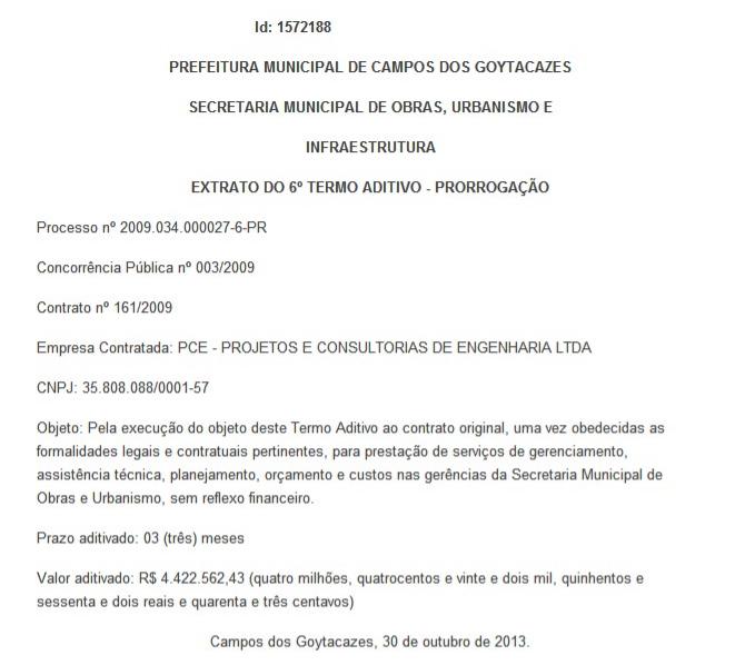 "Em um primeiro momento, parabéns a empresa PCE, pela eficiência e qualificação apresentada em serviços prestados a Prefeitura Municipal de Campos dos Goytacazes_PMCG, posto que, uma prestadora de serviço que teve seu contrato inicial prorrogado por seis vezes, só pode ter cumprido em 100% seu objeto. " No nosso caso específico, o de atender, mesmo que "por osmose" às diversas demandas desta desatenta população do município de Campos dos Goytacazes. Percebemos o