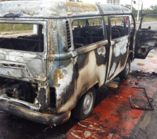 Em seguida, o Corpo de Bombeiros foi acionado e controlou rapidamente as chamas. Todo o interior do veículo ficou destruído. Apesar do susto, os dois homens que estavam na kombi saíram a tempo e não ficaram feridos.
