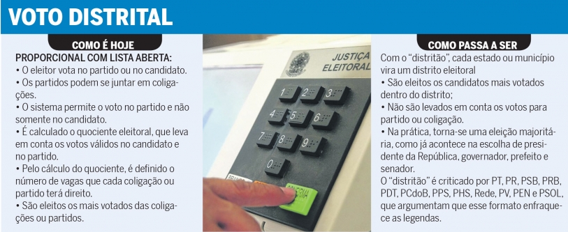 A PEC fixa o voto majoritário para deputados federais e estaduais, em 2018, e vereadores, em 2020 – o chamado “distritão”, pelo qual é eleito quem recebe mais votos. O sistema atual é chamado de proporcional – para ser eleito, o candidato conta com os seus votos e com aqueles dados ao partido ou à coligação.