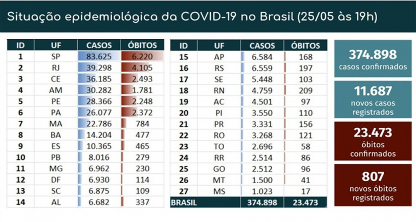 O Ministério da Saúde divulgou nesta segunda-feira (25) o mais recente balanço de casos e mortes causadas pelo novo coronavírus. Os principais dados são: 23.473 mortes em decorrência da doença, eram 22.666 no domingo (24). Foram 807 registros de morte incluídos no balanço em 24 horas. Além disso, o país tem 374.898 casos confirmados, sendo 11.687 incluídos no balanço diário.
