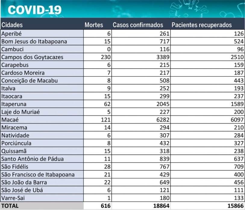 O número de mortes e casos positivos de Covid-19 no Norte e Noroeste Fluminense aumentou neste domingo (9). Com as atualizações, as duas regiões possuem 616 óbitos e 18.863 pessoas infectadas desde o início da pandemia. Destes, 15.866 pacientes já se recuperaram da doença.