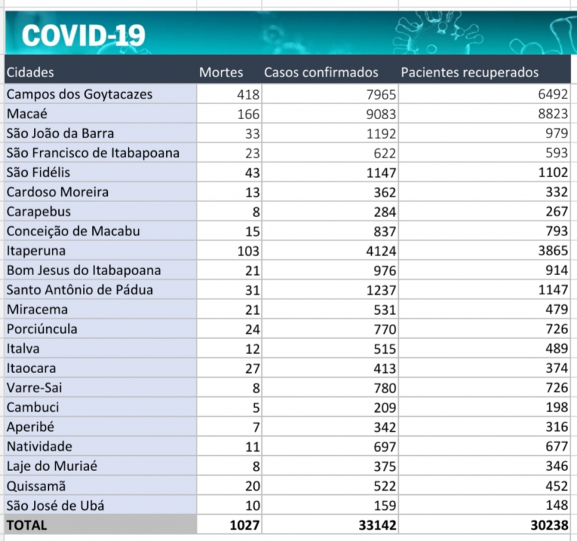 O Norte e o Noroeste Fluminense registraram, nesta quinta-feira (22), novos casos e mortes por coronavírus. No total, as duas regiões somam 1.027 mortes, 33.142 pessoas infectadas pela Covid-19 e 30.238 recuperados.