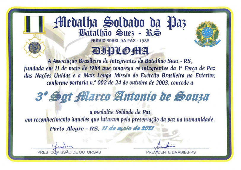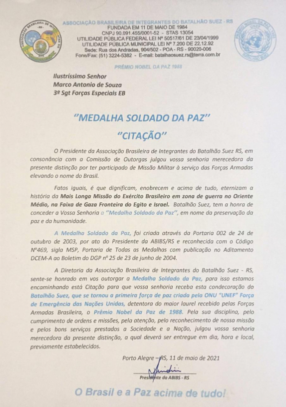 1° Caçador de Operações Especiais do Brasil, pioneiro do DCT-Destacamento de Contraterror das Forças Especiais Brasileiras, melhor sniper da América Latina e um dos 3 melhores do mundo, o sargento da Reserva do EB, Marco Assombroso Souza, herói no Haiti, ganhou durante esta semana, mais uma justa homenagem, a cobiçada Medalha Soldado da Paz, vinda da Associação Brasileira de Integrantes do Batalhão Suez-RS, importante agremiação de cunho militar brasileiro, cujos associados foram soldados em missão de paz da ONU no Egito, na mais longa estadia das Forças Armadas do Brasil no exterior, em pleno auge da Guerra Fria.