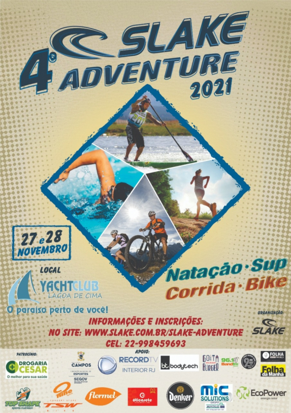 Nos dias 27 e 28 de novembro, o Yacht Club Lagoa de Cima, em Campos, vai receber a quarta edição do Slake Adventure, evento com disputas em quatro esportes. Estão confirmadas provas de natação, stand-up paddle, corrida e ciclismo, sendo os dois últimos na modalidade de trilha. As inscrições estão abertas até o próximo dia 8 e devem ser feitas pelo site www.slake.com.br/slake-adventure ou pelo telefone (22) 99845-9693. Apoio: Folha da Manhã.