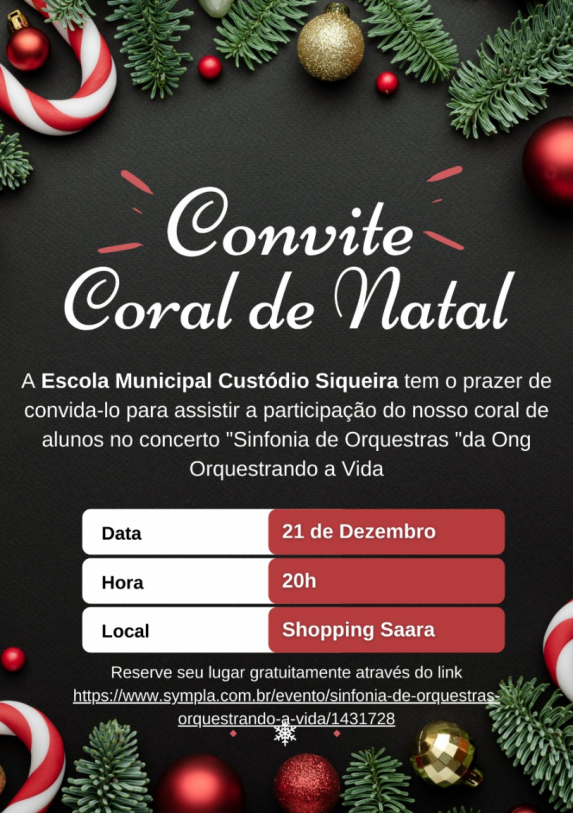 Entre os participantes confirmados, estão os integrantes do coral de alunos da Escola Municipal Custódio Siqueira, com apresentação especial de Natal.